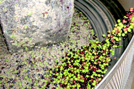 搗碎橄欖 清潔過後的橄欖倒入絞碎機中,不斷重複這過程可充分的利用橄欖果肉增加整體出油量 |  |